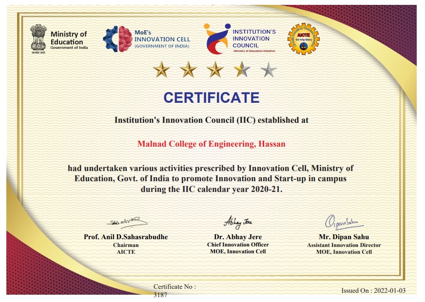 Ministry of Education (MoE), Govt. of India has established ‘ MoE’s Innovation Cell (MIC)’ to systematically foster the culture of innovation amongst all Higher Education Institutions(HEIs). The primary mandate of MIC is to encourage, inspire, and nurture young students by supporting them to work with new ideas and transform them int prototypes while they are informative years. MIC has envisioned encouraging the creation of ‘Institution’s Innovation Council (IICs)’ across selected HEIs. A network of these IICs will be established to promote innovation in the Institution through multitudinous modes leading to an innovation promotion eco-system in the campuses. In collaboration with ME-RIISE (Malnad Enclave for Research, Innovation, Incubation, Start-ups, and Entrepreneurship ) Institution Innovation Cell has been established in the college with the vision of fostering innovation and support students to enrich their spirit of entrepreneurship.