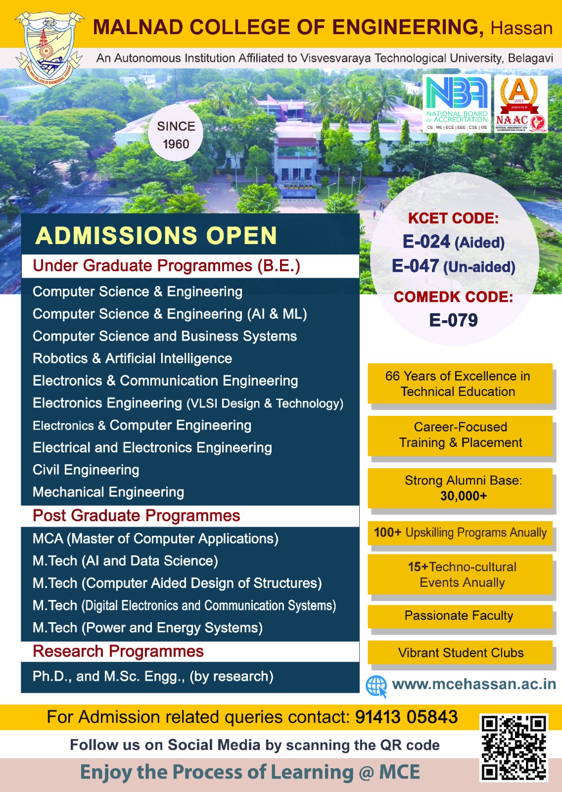 Contact NowMalnad College of Engineering established in the year 1960, during the second 5 year plan, as a joint venture of Government of India, Government of Karnataka and the Malnad Technical Education Society, Hassan.